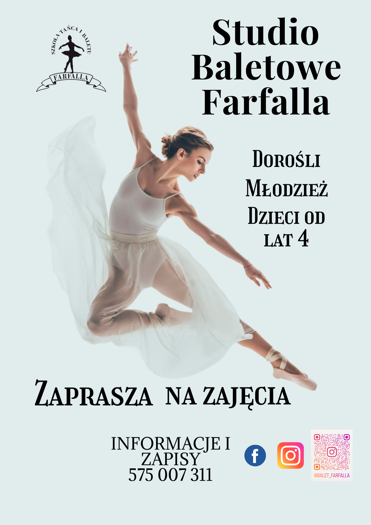 Szkoła Tańca i Baletu Farfalla zaprasza na zajęcia dzieci od lat 4, młodzież oraz dorosłych na zajęcia baletowe.
